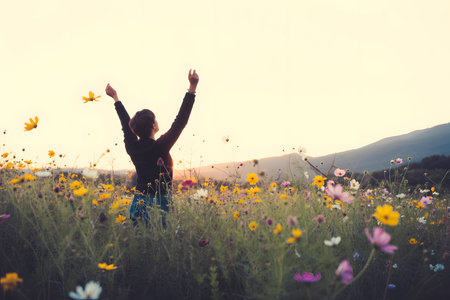 Triumphant silhouette in a vibrant wildflower meadow at golden hour, framed by rolling mountains and a dreamy sunset sky. Soft, warm tones enhance the serene atmosphere.
