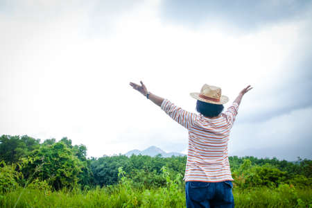 Happy old women travel in the mountains during the rainy season. Senior community retirement concept