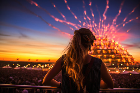 Generative AI Image of A Beautiful Woman Standing on a Wooden Plank by the Lake with Fireworks