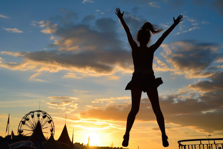 A woman is jumping in the air with her arms raised, silhouetted against a beautiful sunset. Scene is joyful and uplifting, as the woman's exuberant pose