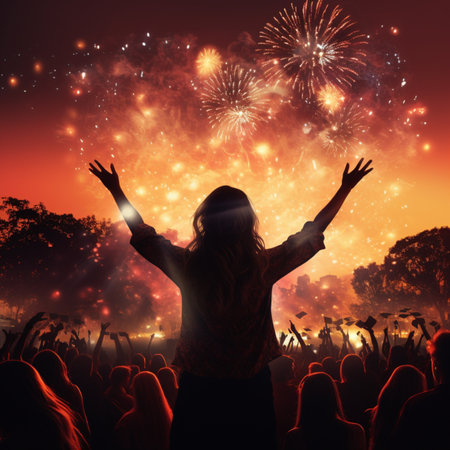 A captivating firework display illuminating the night sky during a cultural celebration, with spectators gathered to witness the spectacle, symbolizing joy and communal spirit.