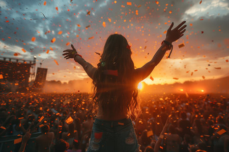 Evening outdoor music festival atmosphere enriched by colorful confetti cascading under vibrant lights, igniting joy