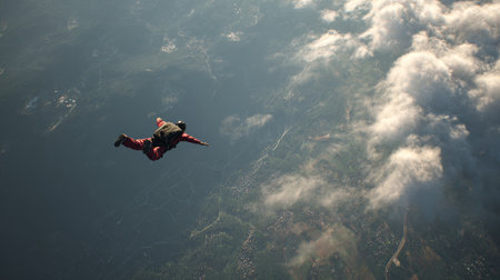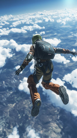 A thrilling view of a skydiver free-falling against a backdrop of clouds and blue sky, capturing the excitement of flying.