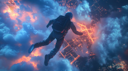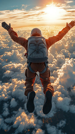 Experience the thrill of a skydiver in free fall surrounded by fluffy clouds during a breathtaking sunset. A perfect blend of adventure and natural beauty captures the essence of freedom.