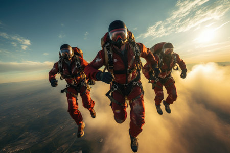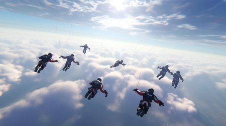 A global team celebrating success while skydiving, capturing their excitement as they freefall towards the Earth