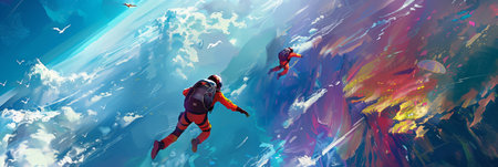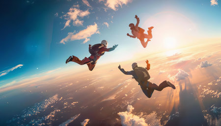 Friends enjoy a thrilling skydiving adventure, soaring over a picturesque landscape, embodying the bucket list lifestyle with adrenaline and panoramic vistas bucket list lifestyle, banner