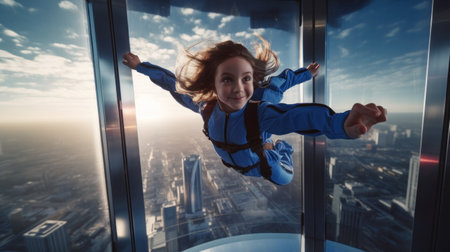 A businessman plunges through the air amidst tall skyscrapers, his figure captured in striking motion blur against a city backdrop.