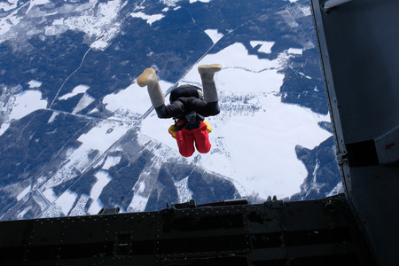 Skydiving. Exit. Opened door. The beginning of the tandem jump.