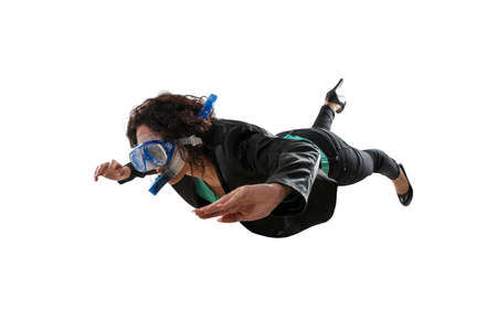 Businesswoman with mask swims isolated on white background