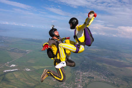 A girl and a guy skydivers perform pieces in free fall