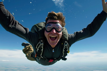 A man in a helmet and goggles skydiving with his mouth open, AI