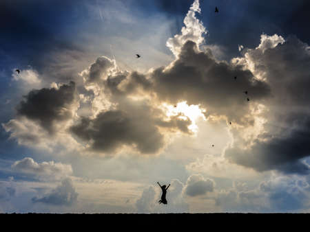 Happy person jumping up and down in front of a dramatic sky