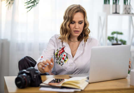 A girl - a photographer looks at pictures on a laptop at a table with notepads, a phone and a camera in the room