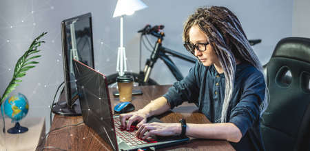 Modern young female programmer is writing program code on a laptop at home. Remote work in the IT profession. The concept of software development.