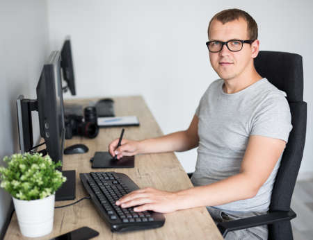 portrait of young handsome male photographer editing images with computer in modern office or at home
