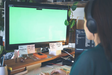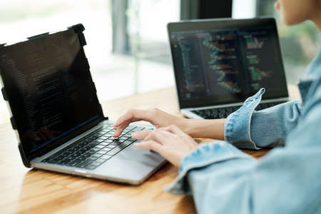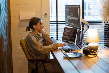 Woman writing programming code on laptops and desktop computer at cozy home workplace. Concept of remote programmer work at home