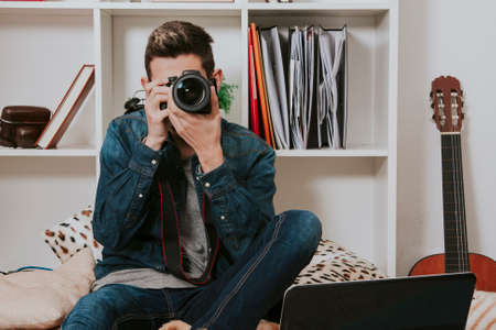 One young Caucasian man, photographer, cameraman with professional camera, equipment during working at office, indoors. Concept of occupation, job, education