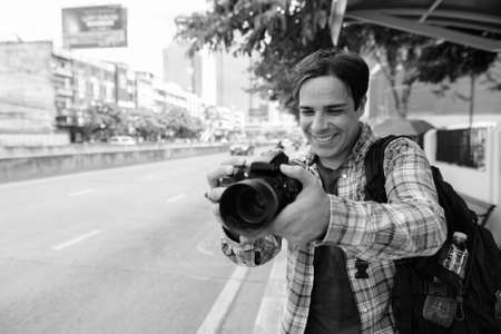 Happy bearded man taking photo. Tourist with photocamera in city. Travel and tourism. Photographer.