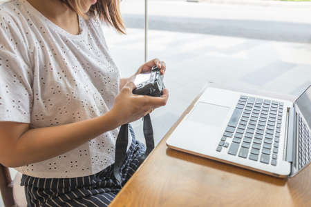 Happy young woman with photo camera using laptop at home. The photographer looks at the pictures taken and sits on the couch.