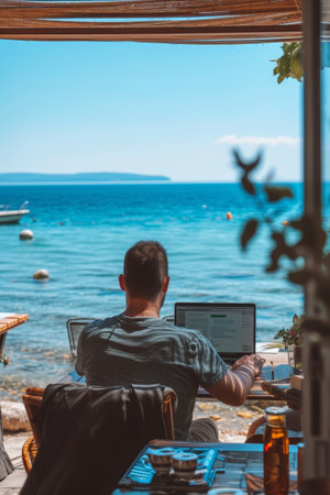 A person working on a laptop by the sea, surrounded by nature, under a clear sky