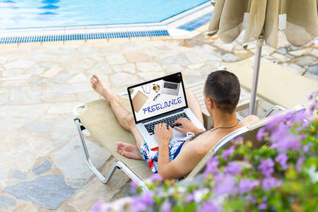 man with a laptop relaxing on sun lounger near pool