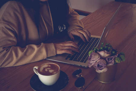 Woman professional freelance content writer keyboarding on laptop computer while resting in coffee shop. Female entrepreneur having online training course via portable notebook. Using web page