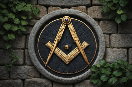 Golden masonic symbol with compass and square on a stone wall, representing the concepts of freemasonry, brotherhood, and secret societies
