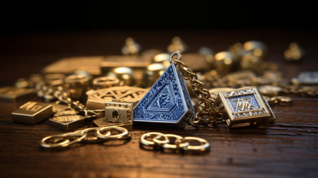 Close-up of masonic symbol featuring providence eye within triangle, showing intricate details and textures on metallic surface