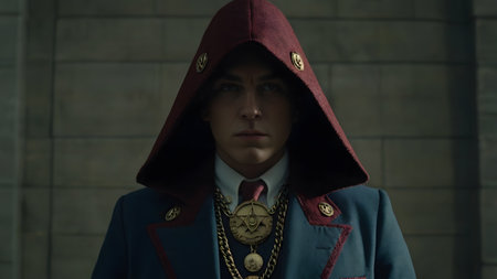 A group of men, mostly obscured, are wearing red robes and standing in a large space. The individuals are likely participating in a religious ceremony or other formal event.