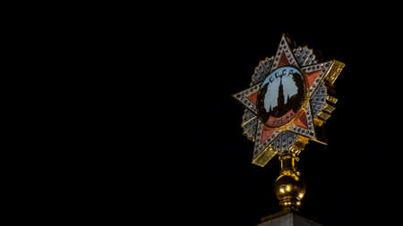 Monument of Victory in the center of Minsk at the night. A memorable place in honor of the heroism of the people during the Great Patriotic War. Heroism concept.