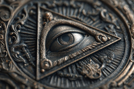 Close-up of masonic symbol featuring providence eye within triangle, showing intricate details and textures on metallic surface