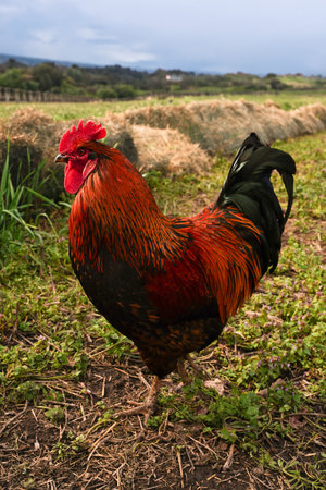 close up of a breed rooster in the yard, portrait of a farm rooster in the yard