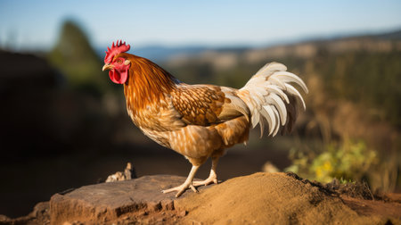 A rooster strutting confidently in a rural farm setting, embodying the spirit of strength and vitality.