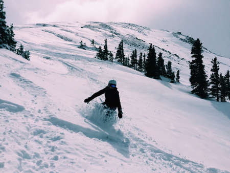 Young snowboarder in stylish sportswear riding down the powder snow hill on the sunny day