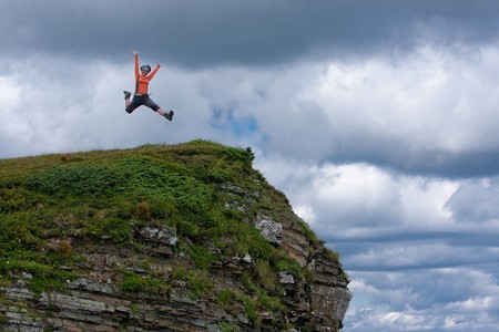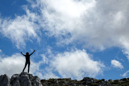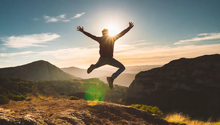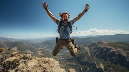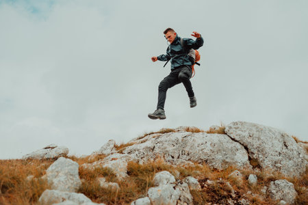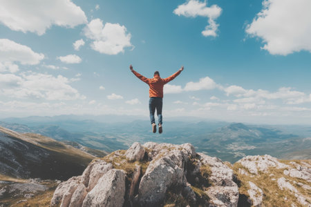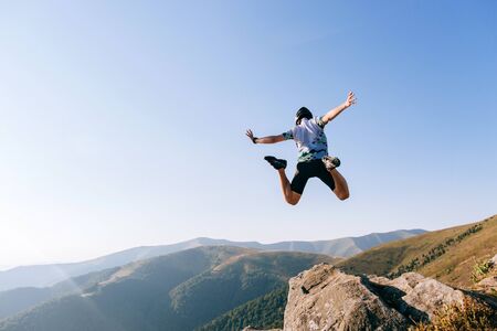 Man jumping on the top of the mountains raising arms up enjoying freedom