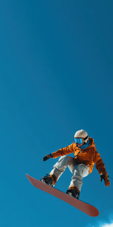 Snowboarder leaping against a vibrant blue sky captivating winter sports action shot