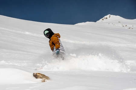 Snowboarder having fun skiing offside on the snowy mountain of the Hintertuxer Glacier (Tuxer Ferner) in Tyol, Austria