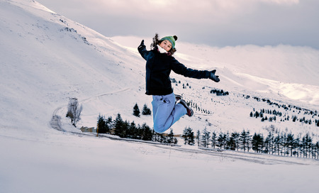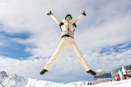 Cheerful woman jumping in the mountains covered with snow, spending winter holidays on the ski resort, enjoying winter vacation, happy active lifestyle