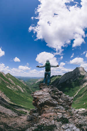 Back view of a man standing against the background of mountains with his arms outstretched. The man in the mountains raises his hands. Man on the background of mountains. Travel to the mountains