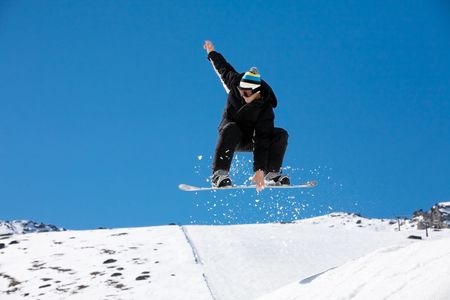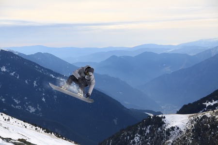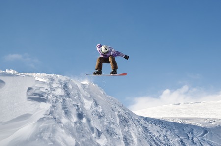 Freerider snowboarder doing speed trick air jump with his snowboard. Winter mountain freeride