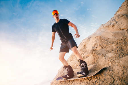 Extreme descent sand on snowboard in desert. Male snowboarder on dunes
