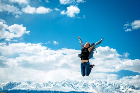 Young woman in jeans jumps high into the air on the background of mountain peaks covered with snow and blue sky with white clouds. Spectacular views of mountain range. Travel and discovery concept.