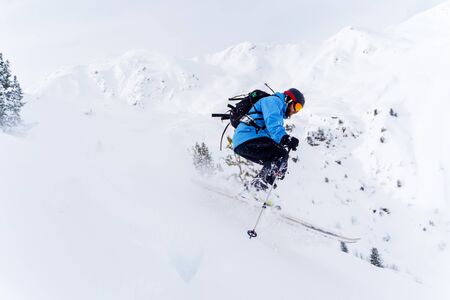 A skier at speed rides on a snowy slope freeride. The concept of winter extreme sports