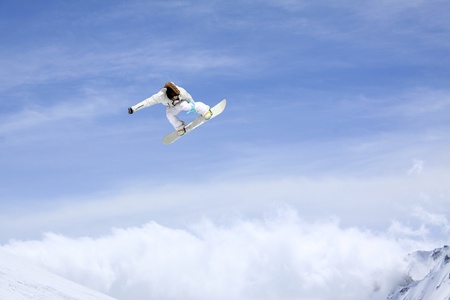Flying snowboarder on mountains. Extreme winter sport. Copy space