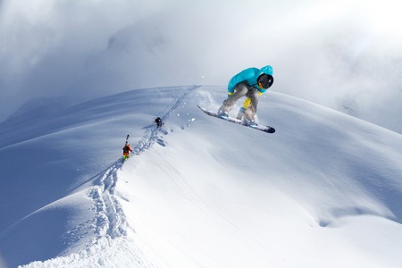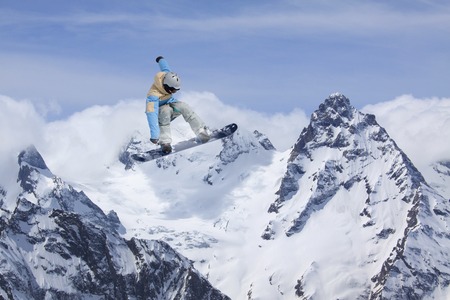 Snowboard rider jumping on snowy mountains. Extreme snowboard freeride sport.