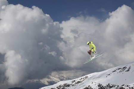 freeride skier jumps in the air against the backdrop of mountain landscape