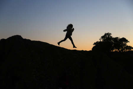 silhouette of a man in a hat while running and jumping on an orange background. running from the problems of people from the city to nature outdoors