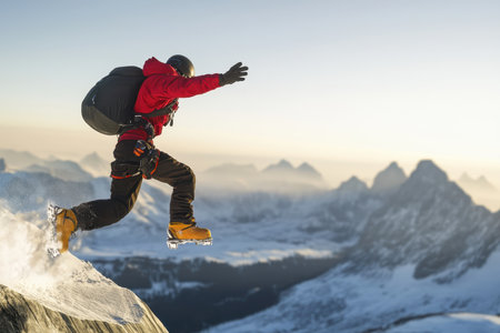 A climber in bright red gear jumps off a rocky edge into a snowy valley surrounded by majestic peaks.