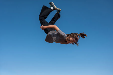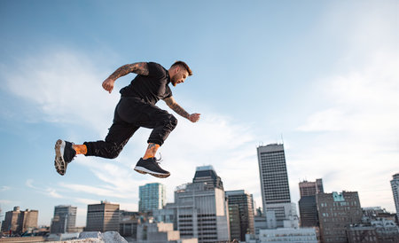 A man is captured mid-air, performing a jump against the backdrop of an urban landscape. The image features a bright blue sky, with the sun casting natural light. The composition highlights a sense of motion and activity, suitable for various editorial and commercial applications. The scene evokes a dynamic and energetic atmosphere.