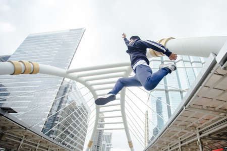 asian fitness man in sportswear jumping exercising in city business center.